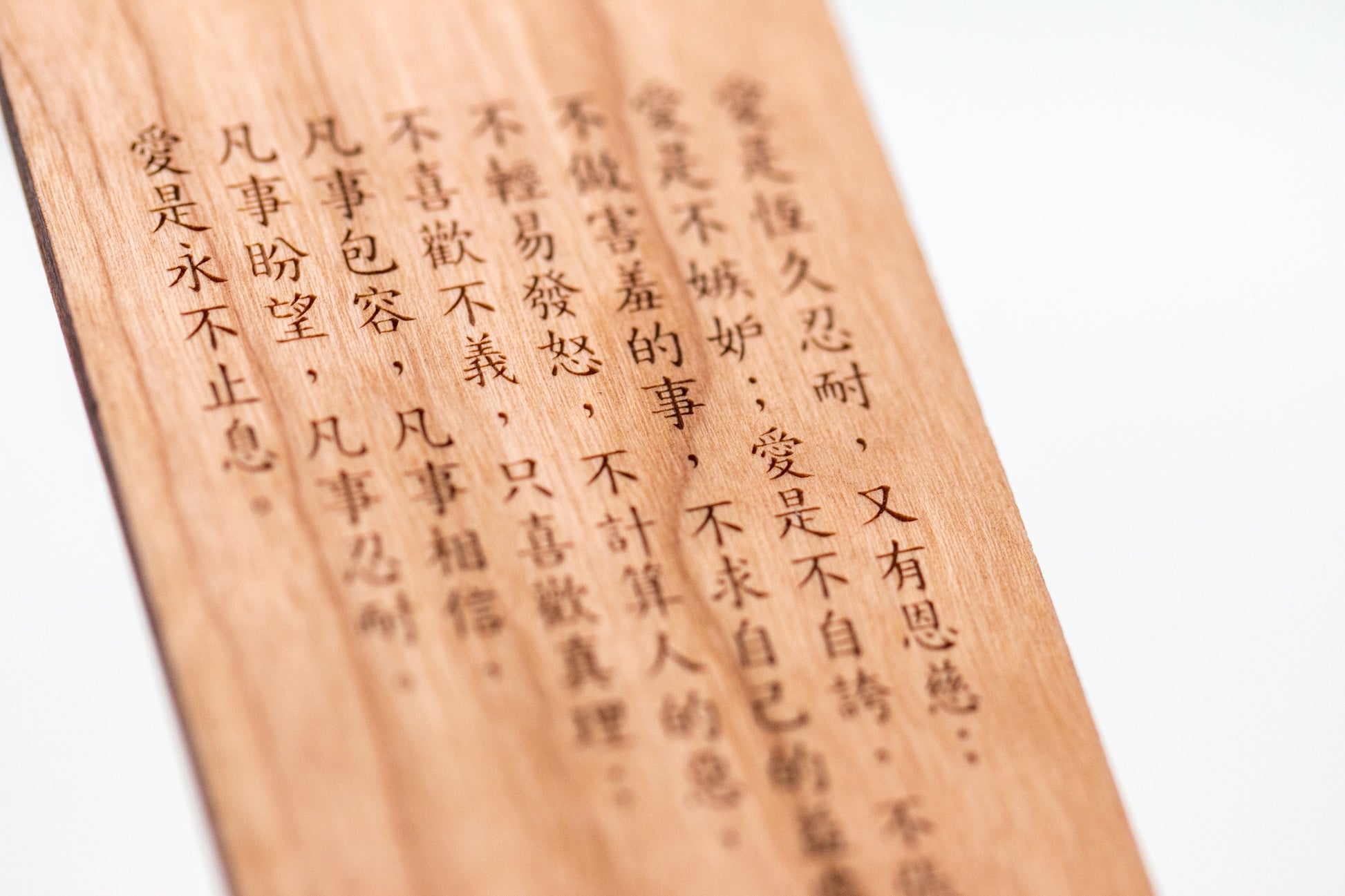 From “love suffers long and is kind” to “love never fails” in 1 Corinthians 13:4-8, this attractive bookmark is etched in the traditional Chinese translation of the verse on the front (with the traditional character for love with the heart kept in) and the KJV verse etched in English on the back. I use it as a daily self-reflection of my interactions with others to help me assess if I have been patient, kind, think the best of others, see beyond someone’s current situation, and consider their potential and what they can become, and so on.